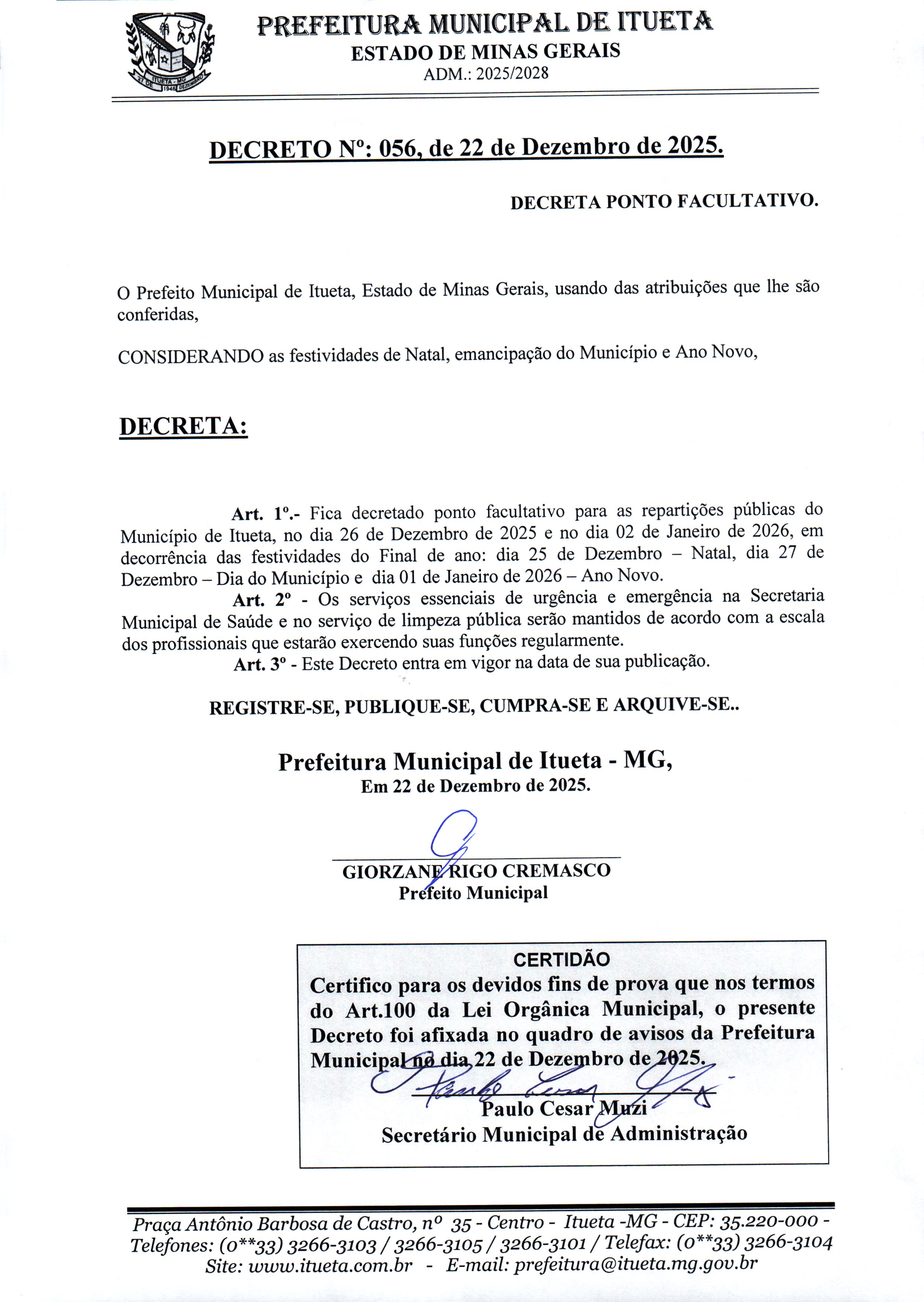 A Prefeitura Municipal de Itueta, Minas Gerais, decretou ponto facultativo para as repartições públicas do município para o dia 26 de novembro de 2025 e 02 de janeiro de 2026.